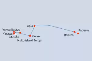 Itinerario : Lautoka, Kadavu Island, Fulaga, Vavau, Nukupule Island, Apia, Aitutaki, Raiatea, Huahine, Papeete