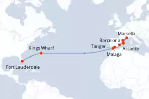Itinerario : Barcelona, Marsella, Palma de Mallorca, Alicante, Malaga, Tánger, Kings Wharf, Fort Lauderdale