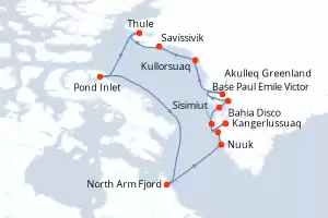 Itinerario : Kangerlussuaq, Sisimiut, Bahia Disco, Base Paul Emile Victor, Akulleq Greenland, Kullorsuaq, Savissivik, Thule, Pond Inlet, North Arm Fjord, Nuuk, Evighedsfjorden, Kangerlussuaq