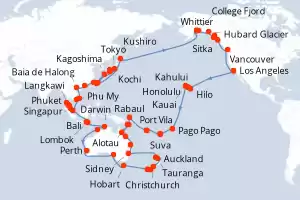 Itinerario : Los Angeles, Hilo, Kahului, Honolulu, Kauai, Pago Pago, Suva, Isla Dravuni, Port Vila, Luganville, Rabaul, Alotau, Conflict Islands, Cairns, Airelie Beach, Brisbane, Sidney, Auckland, Tauranga, Christchurch, Dunedin, Fjordland, Hobart, Adelaide, Perth, Kimberley Coast, Darwin, Bali, Lombok, Singapur, Phuket, Langkawi, Penang, Kuala Lumpur, Phu My, Cami Ranh, Baia de Halong, Hong Kong, Taipei, Ishigaki, Kagoshima, Kochi, Osaka, Tokyo, Miyako, Kushiro, Whittier, College Fjord, Hubard Glacier, Sitka, Juneau, Ketchikán, Vancouver, Los Angeles