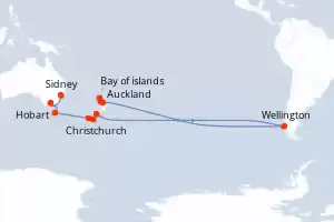Itinerario : Auckland, Bay of islands, Tauranga, Wellington, Christchurch, Dunedin, Fjordland, Hobart, Melbourne, Sidney