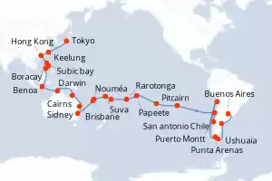 Itinerario : Sidney, Nouméa, Lifou, Suva, Nukualofa, Rarotonga, Papeete, Pitcairn, Isla de Pascua, San antonio Chile, Puerto Montt, Chacabuco, Punta Arenas, Ushuaia, Puerto Madryn, Buenos Aires