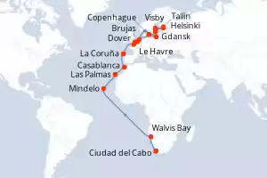 Itinerario : Adelaide, Perth, Ile Maurice, Ciudad del Cabo, Walvis Bay, Mindelo, Las Palmas, Casablanca, La Coruña, Le Havre, Brujas, Gdansk, Visby, Helsinki, Tallin, Estocolmo, Copenhague, Ijmuiden, Dover