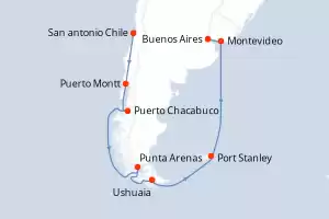 Itinerario : Buenos Aires, Montevideo, Punta del Este, Puerto Madryn, Puerto Argentino, Ushuaia, Punta Arenas, Puerto Chacabuco, Puerto Montt, San antonio Chile