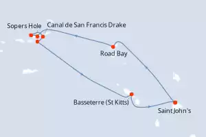Itinerario : Saint John's, Gustavia, Canal de San Francis Drake, Norman Island, Sopers Hole, Islas Virgenes, Spanish Town, Jost Van Dyke, Philipsburg, Basseterre (St Kitts), South Friar's beach, Saint John's
