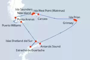 Itinerario : Punta Arenas, Isla de Goicoechea, West Point Island Falkland, Isla Trinidad, Isla del Rosario, Puerto Argentino, Cabo Rosa, Prion Island, Godthul, Grimsey, Bahia Fortuna, Stromness, Bahia de San Andrews, Antarctic Sound, Islas Shetland del Sur, Estrecho de Guerlache, Islas Shetland del Sur, Puerto Williams, Punta Arenas