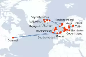 Islandia te promete montañas y maravillas. El fin del mundo, Latrabjarg, coloridos pueblos costeros como Grundarfjordur, y fiordos como el de las ballenas, Hvalfjördur, te esperan para que disfrutes al máximo. Un reino donde los volcanes y el hielo se mezclan, este territorio no deja indiferente a nadie. De día y de noche, su magia fascina. Sol de medianoche, aurora boreal: eliges la temporada adecuada para tu crucero y disfrutas del espectáculo que ofrecen lugares naturales únicos, como el fiordo de Breidafjördur, no lejos de la península de Snaefellesnes.